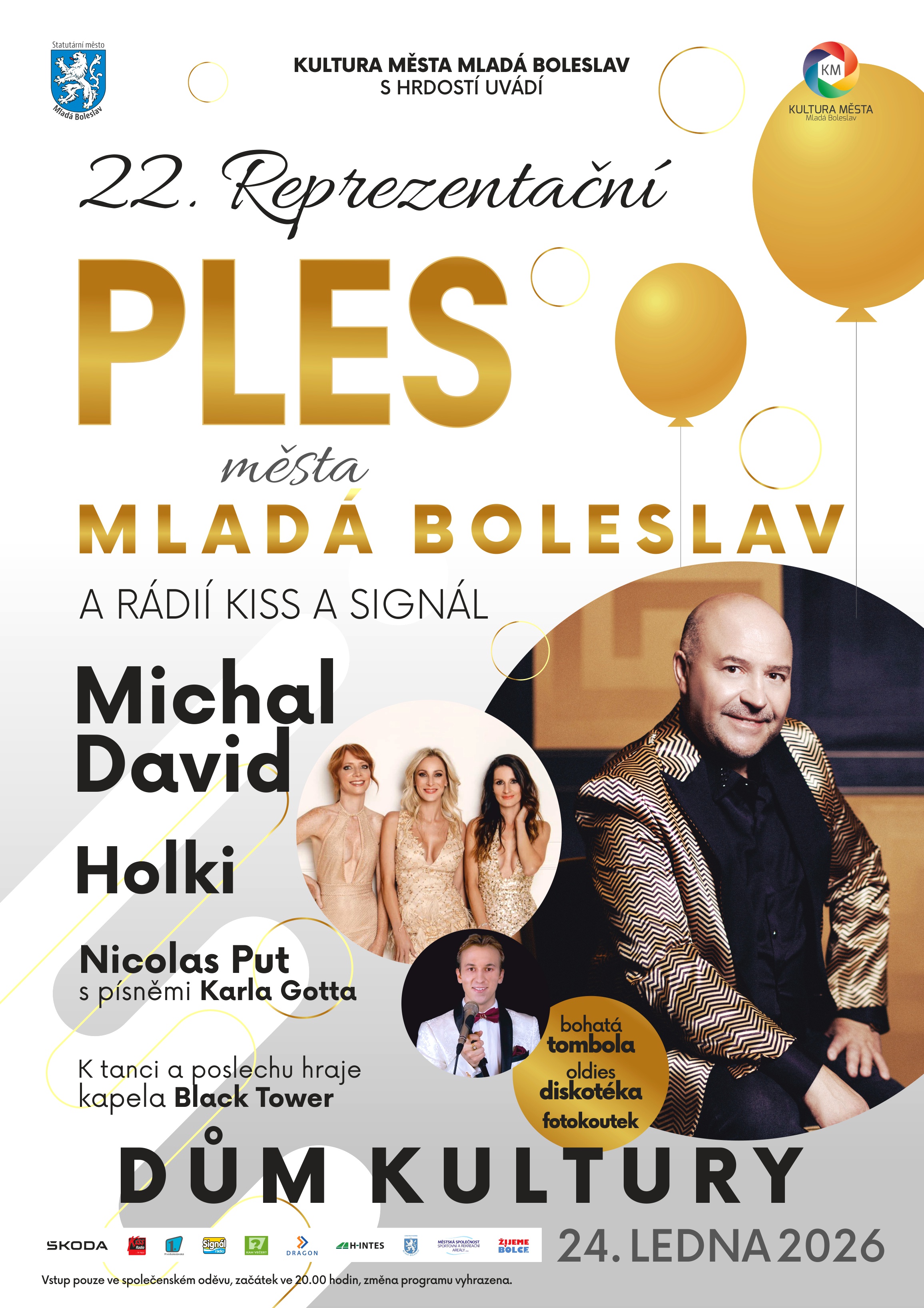 Kultura města Mladá Boleslav vás zve na 22. Reprezentační ples města Mladá Boleslav a rádií Kiss a Signál. Vystoupí Michal David, skupina Holki, Nicolas Put s písněmi Karla Gotta.