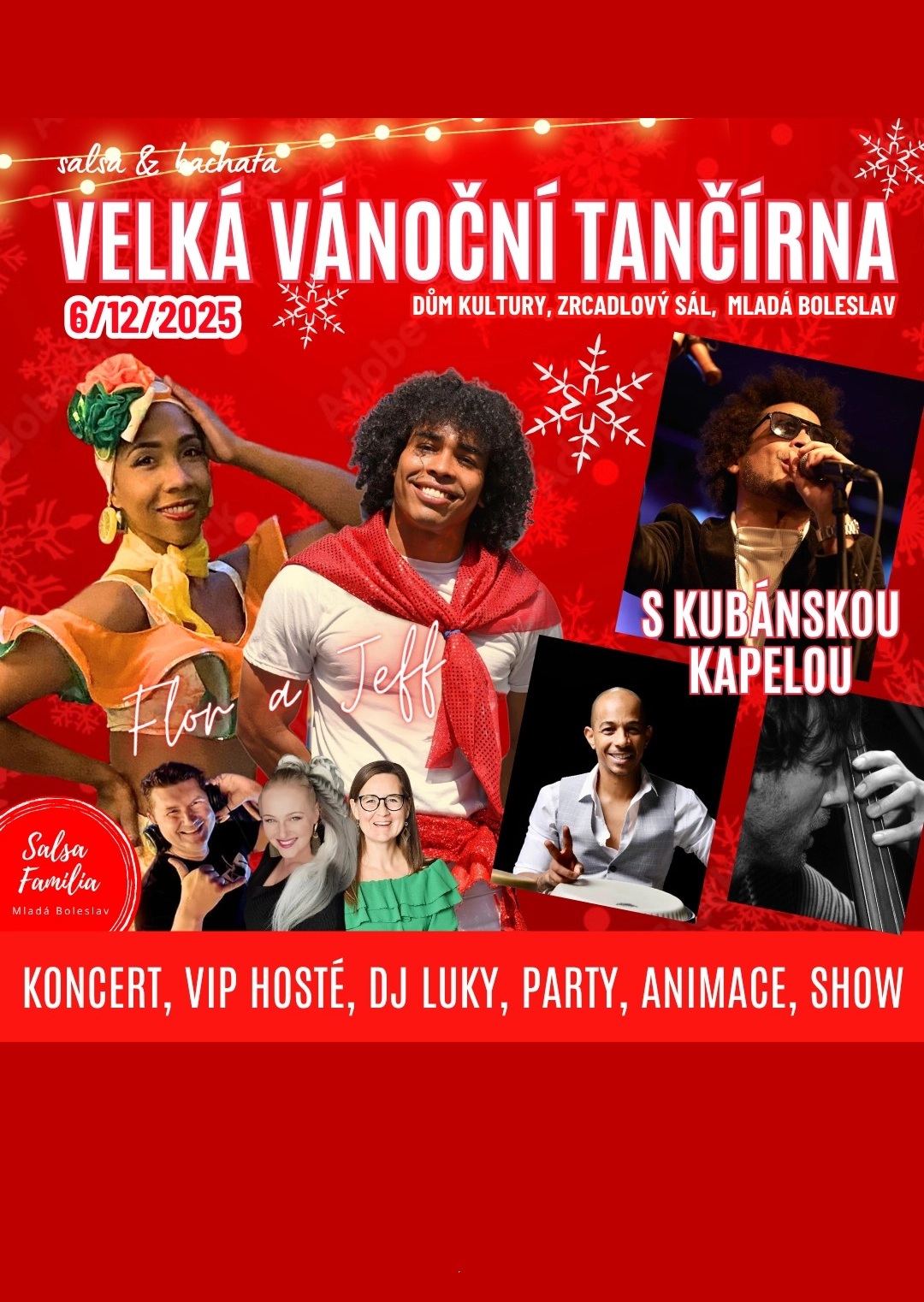 Je to tady!!! Naše báječná Vánoční tančírna s živou kapelou má datum, a to 6.12. Letos pro vás máme nové hosty Jeffa a Flor, na které se moc těšíme a jsme zvědaví. Hudbu zajistí opět kubánská kapela, ať to má to správné kouzlo a těšíme se na všechny taneční přátelé nejen z naší Salsa Familia, ale také z LBC, JBC, HK, Pardubic, Prahy, Ústí a jiných měst.